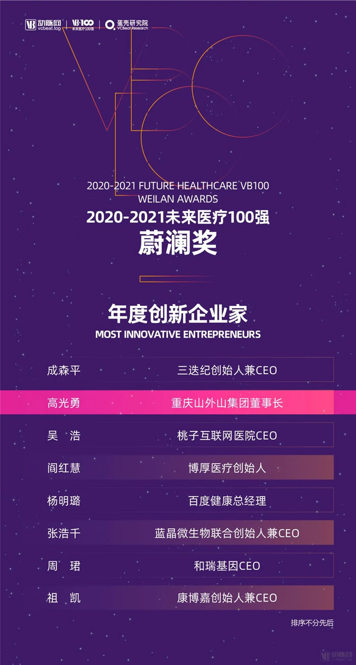 此外,山外山公司創(chuàng)始人兼董事長(zhǎng)高光勇憑借持續(xù)創(chuàng)新求變的發(fā)展理念,獲得“2020-2021未來醫(yī)療100強(qiáng)·蔚瀾?yīng)?middot;年度創(chuàng)新企業(yè)家”榮譽(yù)。捷報(bào)連連,再次體現(xiàn)了山外山公司在醫(yī)療器械產(chǎn)業(yè)的前瞻探索和卓越創(chuàng)新獲得業(yè)界認(rèn)可。