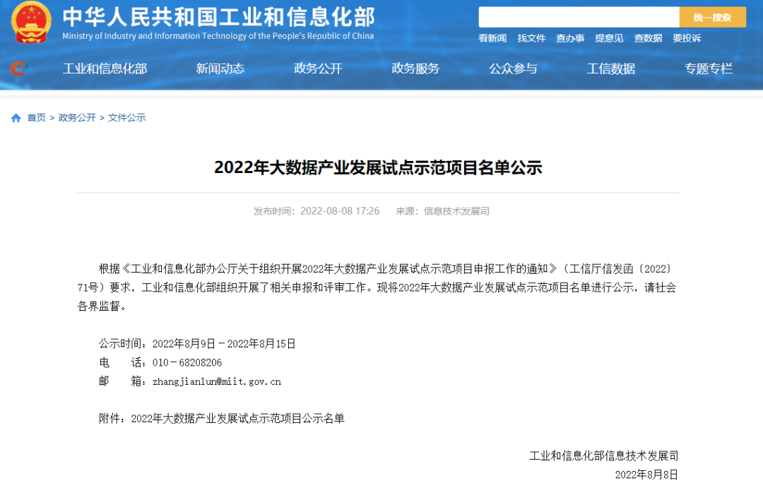 近日,工業(yè)和信息化部信息化和軟件服務(wù)業(yè)司正式公布“2022年大數(shù)據(jù)產(chǎn)業(yè)發(fā)展試點(diǎn)示范項(xiàng)目”名單。
