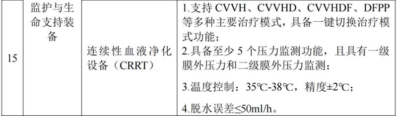 根據(jù)此前國家工信部及衛(wèi)健委發(fā)布的《2024年高端醫(yī)療裝備推廣應(yīng)用項目申報工作的通知》,申報監(jiān)護與生命支持裝備項目中的連續(xù)性血液凈化設(shè)備(CRRT)需滿足以下四個要求: