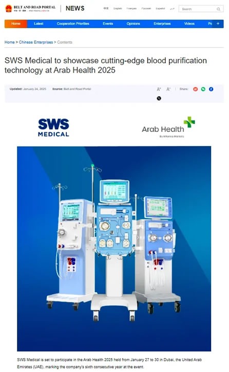 2025年1月24日,中國一帶一路網(wǎng)刊文《SWS Medical to showcase cutting-edge blood purification technology at Arab Health 2025》,聚焦重慶山外山血液凈化技術(shù)股份有限公司(山外山,科創(chuàng)板股票代碼:688410)將在2025年阿拉伯國際醫(yī)療設(shè)備展上展示前沿血液凈化解決方案。