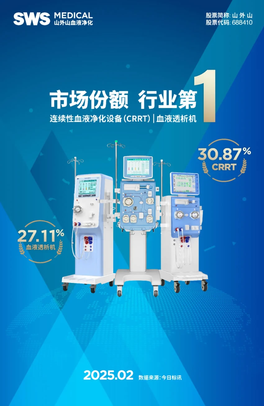 尤為值得一提的是,2025年2月,山外山連續(xù)性血液凈化設(shè)備(CRRT)和血液透析機(jī)分別以30.87%、27.11%的超高市場(chǎng)份額雙雙沖上冠軍寶座,均躍居行業(yè)第一。
